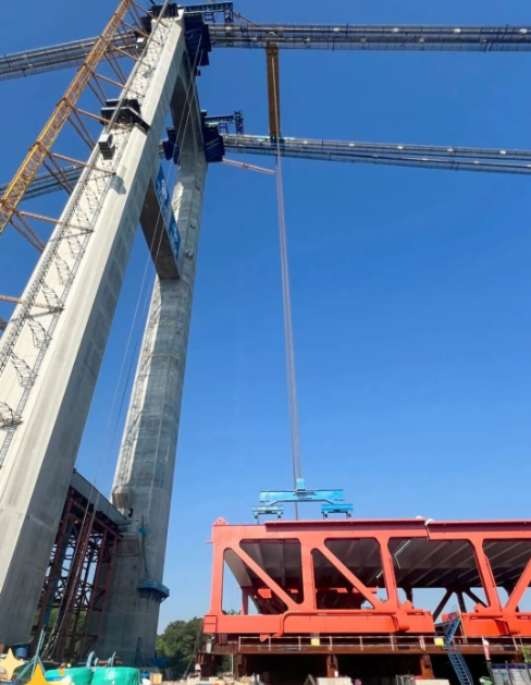 The Yanji Yangtze River Bridge, with a main span of 1,860 m, uses steel truss segments weighing up to 828.8 tons. To lift these ultra-heavy sections across four main cables, OVM developed the world’s largest 1,000-ton cable crane.