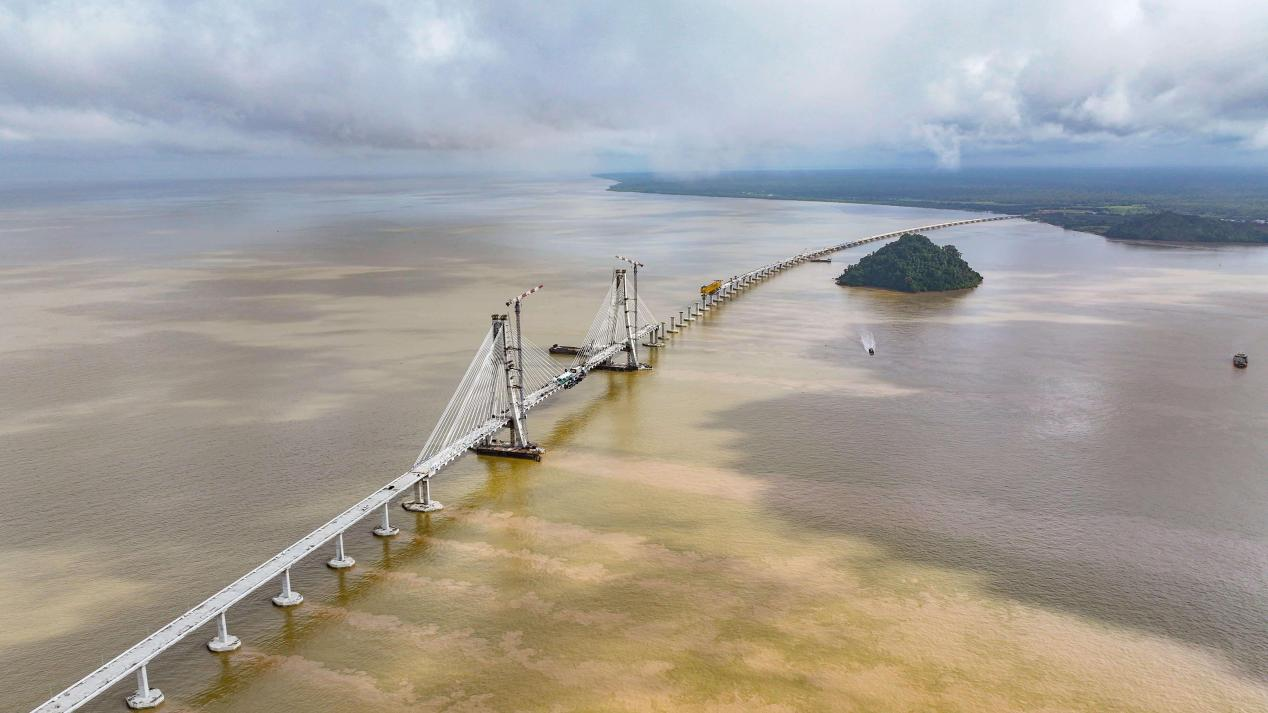 Located at the estuary of the Lupar River, approximately 112 km from Kuching, this H-pylon double-plane cable-stayed sea-crossing bridge stands as a landmark where river meets sea. With a main span of 324.4 meters and total length of 4,884 metres, it is currently Malaysia's largest single bridge project under construction, Sarawak's longest bridge, and the region's largest π-girder high-pylon cable-stayed bridge.